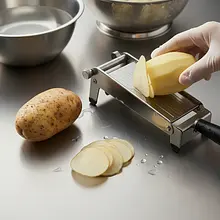 Pokrój ziemniaki na bardzo cienkie, niemal przezroczyste plasterki o grubości około 1-2 mm. Najlepiej użyć do tego mandoliny kuchennej, która zapewni idealnie równe plasterki. Jeśli jej nie masz, użyj bardzo ostrego noża i tnij powoli i ostrożnie. Pokrojone plasterki od razu wrzucaj z powrotem do miski z zimną wodą.