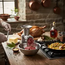Przygotuj maszynkę do mielenia mięsa. Zmiel razem: obrane mięso gęsie, uduszone warzywa, całą zawartość patelni (wątróbkę ze śliwkami i cebulą) oraz namoczoną w bulionie bułkę. Użyj sitka o średnich oczkach. Następnie, aby uzyskać idealnie gładką i aksamitną konsystencję, zmiel całą masę jeszcze raz, tym razem używając sitka o najdrobniejszych oczkach.