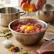 Przełóż zmieloną masę do dużej miski. Wbij dwa jajka. Dodaj sól, świeżo mielony pieprz oraz roztarty w dłoniach majeranek. Dodatkowo, dla wzbogacenia aromatu, możesz zetrzeć odrobinę gałki muszkatołowej. Teraz stopniowo dolewaj pozostały, przecedzony przez sito bulion (około 150-200 ml), cały czas mieszając masę. Masa powinna mieć konsystencję bardzo gęstej śmietany lub pasty do smarowania. Dokładnie wyrabiaj ją ręką lub drewnianą łyżką przez kilka minut, aż będzie jednolita i dobrze napowietrzona.