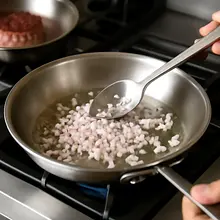 W tej samej patelni, z której wyjąłeś steki, zmniejsz ogień do średniego. Dodaj posiekaną szalotkę i smaż 2-3 minuty, aż zmięknie i stanie się szklista. Dodaj drobno posiekany czosnek (jeśli użyty) i smaż jeszcze 20-30 sekund, uważając, by się nie przypalił.