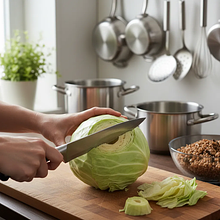 Przygotuj główkę kapusty. Ostrym, długim nożem wytnij głąb, czyli twardy rdzeń u nasady kapusty. Wbijaj nóż pod kątem wokół głąba, tworząc stożek, a następnie podważ i wyjmij go. Dzięki temu liście będą łatwiej odchodzić podczas parzenia.