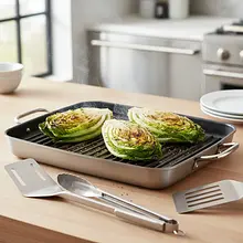 Połóż połówki sałaty na gorącej patelni grillowej, przeciętą stroną do dołu. Grilluj przez 1-2 minuty bez poruszania, aż pojawią się wyraźne, ciemne paski od grilla, a liście na brzegach lekko zwiędną. Następnie za pomocą szczypiec kuchennych delikatnie obróć sałatę na drugą stronę i grilluj przez kolejną minutę. Sałata powinna być z zewnątrz przypieczona, a w środku wciąż chrupiąca. Zdejmij z patelni.