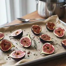 Zacznij od przygotowania wszystkich składników. Piekarnik nagrzej do 200°C z funkcją termoobiegu lub 220°C w trybie góra-dół. Figi delikatnie umyj pod bieżącą wodą i osusz papierowym ręcznikiem. Odetnij twarde końcówki (ogonek), a następnie przekrój każdą figę na pół, wzdłuż. Gałązki tymianku również opłucz i osusz.