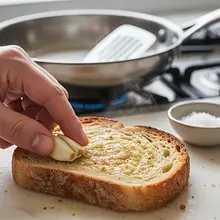 Gdy kromki są jeszcze gorące, weź obrany ząbek czosnku i przetnij go na pół. Energicznie natrzyj chrupiącą powierzchnię każdej grzanki połówką czosnku. Ciepło pieczywa uwolni olejki eteryczne z czosnku, nadając mu wspaniały, subtelny aromat.
