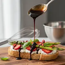 To danie to kwintesencja późnej wiosny na talerzu – lekkie, świeże i zaskakujące połączenie smaków, idealne dla kogoś, kto 'nie jest głodny', ale da się skusić na coś wyjątkowego. Grzanki, czyli włoska bruschetta, w tej odsłonie łączą chrupkość opieczonego pieczywa z kremową delikatnością sera ricotta. Na tym aksamitnym tle pierwsze skrzypce grają sezonowe gwiazdy: lekko chrupiące, blanszowane zielone szparagi oraz soczyste, słodkie truskawki. Całość dopełnia słodko-kwaśna nuta gęstego kremu balsamicznego i świeżość listków mięty. To kompozycja nie tylko pyszna, ale i niezwykle estetyczna – gra kolorów zieleni, czerwieni i bieli sprawia, że jest to małe dzieło sztuki. Idealne jako elegancka przystawka na przyjęciu, lekki lunch lub wykwintna kolacja na tarasie w ciepły wieczór.