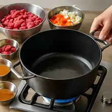 Rozgrzej ciężki garnek (najlepiej żeliwny lub o grubym dnie, średnica 26–28 cm) na średnio-wysokim ogniu. Wlej olej rzepakowy. Smaż mięso partiami (nie wrzucaj wszystkiego naraz, aby temperatura nie spadła) — każdą partię przez 3–5 minut, aż utworzy się głęboki, brązowy chrupiący rumieniec. Po usmażeniu odkładaj kawałki na talerz.