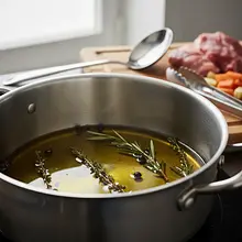 Teraz czas na deglasowanie. Wlej do garnka czerwone wino. Zwiększ ogień i gotuj przez 2-3 minuty, intensywnie mieszając i zeskrobując z dna wszelkie przywarte resztki. Wino powinno częściowo odparować, a alkohol ulotnić się. Następnie włóż z powrotem do garnka obsmażone mięso. Dodaj bulion wołowy, liście laurowe, ziele angielskie i rozgniecione w moździerzu lub płaską stroną noża owoce jałowca. Jeśli używasz, dodaj też namoczone wcześniej i pokrojone suszone grzyby wraz z wodą, w której się moczyły. Zagotuj całość.