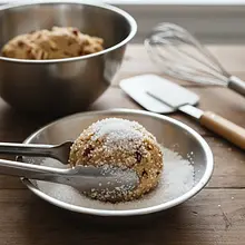 Każdą uformowaną kulkę najpierw dokładnie obtocz w miseczce z cukrem kryształem. Następnie przenieś ją do miseczki z cukrem pudrem i obtocz bardzo obficie. Nie oszczędzaj cukru pudru – warstwa powinna być gruba i całkowicie pokrywać kulkę. To podwójne panierowanie jest sekretem idealnie popękanej powierzchni.