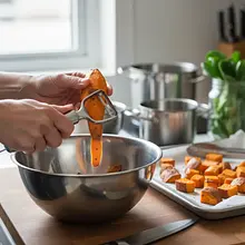 Rozgrzej piekarnik do 200°C (tryb góra-dół). Batata dokładnie umyj, obierz ze skórki za pomocą obieraczki do warzyw i pokrój na równą kostkę o boku około 1,5 cm. Przełóż pokrojonego batata do miski, dodaj jedną łyżkę oliwy z oliwek, paprykę wędzoną, szczyptę soli i pieprzu. Dokładnie wymieszaj dłońmi, aby każda kostka była pokryta przyprawami. Rozłóż bataty w jednej warstwie na blasze wyłożonej papierem do pieczenia i wstaw do nagrzanego piekarnika. Piecz przez 20-25 minut, aż kostki będą miękkie w środku i lekko skarmelizowane na zewnątrz. W połowie pieczenia przemieszaj je łopatką, aby upiekły się równomiernie. Po upieczeniu wyjmij z piekarnika i odstaw do całkowitego wystudzenia.