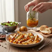 W czasie gdy dynia się piecze, przygotuj dressing. Do małego słoiczka z zakrętką wlej pozostałe dwie łyżki oliwy z oliwek, ocet balsamiczny, płynny miód oraz musztardę Dijon. Dodaj jedną, małą szczyptę soli i świeżo mielonego pieprzu.