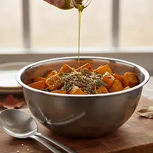Ta sałatka to kwintesencja jesieni na talerzu, łącząca w sobie bogactwo sezonowych smaków i kolorów. Słodka, karmelizowana pieczona dynia hokkaido tworzy idealną parę z soczystą, orzeźwiającą gruszką. Wyrazisty, słony smak sera z niebieską pleśnią przełamuje słodycz, a chrupiące, lekko podprażone orzechy włoskie dodają wspaniałej tekstury. Całość spaja aksamitny sos winegret na bazie oliwy z oliwek, miodu i musztardy Dijon, który doskonale balansuje wszystkie smaki. Sałatka jest nie tylko pyszna, ale i niezwykle efektowna wizualnie – jej ciepłe, jesienne barwy sprawiają, że stanowi ozdobę każdego stołu. Idealnie sprawdzi się jako lekki, ale sycący lunch, elegancka przystawka na przyjęciu lub wykwintny dodatek do dania głównego, np. pieczonego mięsa.
