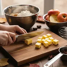 Wyjmij z lodówki 50g zimnego masła i pokrój je ostrym nożem w małą kostkę (ok. 1x1 cm). Dodaj kostki masła do miski z suchymi składnikami. Teraz, używając opuszków palców, szybko rozcieraj masło z mąką i cukrem. Wykonuj ruchy, jakbyś chciał 'szczypać' składniki. Kontynuuj, aż powstaną grudki przypominające mokry piasek. Nie ugniataj zbyt długo, aby masło się nie roztopiło.