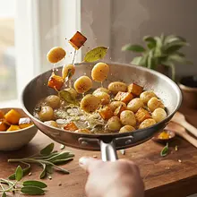 To danie to kwintesencja jesieni na talerzu. Wyobraź sobie miękkie, delikatne kluseczki gnocchi otulone aromatycznym, orzechowym sosem z brązowego masła, w którym chrupią listki szałwii. Do tego słodkie, rozpływające się w ustach kawałki pieczonej dyni Hokkaido, która wnosi piękny kolor i kremową konsystencję. Całość jest zapieczona pod warstwą wyrazistego Parmezanu, a na koniec posypana prażonymi orzechami laskowymi dla dodania chrupkości. Jest to danie niezwykle satysfakcjonujące, eleganckie, a jednocześnie proste w przygotowaniu. Idealnie sprawdzi się na kolację we dwoje, obiad dla gości lub po prostu, gdy masz ochotę na coś wyjątkowego i pocieszającego w chłodny dzień. Połączenie smaków – słodkiego, słonego, orzechowego i ziołowego – tworzy harmonijną kompozycję, która zachwyci każdego smakosza.