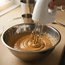 Zmniejsz obroty miksera do minimum. Cienką strużką, bardzo powoli, wlewaj olej do ubitej masy jajecznej, cały czas miksując. Miksuj tylko do momentu, aż olej połączy się z masą. Nie miksuj zbyt długo, aby nie zniszczyć puszystej struktury, którą uzyskałeś w poprzednim kroku.