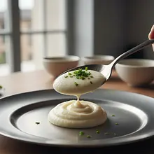 Danie najlepiej prezentuje się na głębokich, ciemnych talerzach, które podkreślą biel purée i sosu. Zamiast płatków migdałowych można użyć posiekanych orzechów włoskich. Do dania pasuje lekkie, białe wino o dobrej kwasowości, np. Sauvignon Blanc lub niebeczkowany Chardonnay.