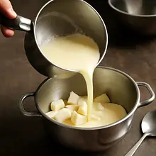 Połam czekoladę na małe kawałki i umieść w metalowej lub żaroodpornej szklanej misce. W małym rondelku podgrzej na niskim ogniu mleko skondensowane razem z masłem — mieszaj drewnianą łyżką, aż masło się rozpuści i masa będzie równomiernie płynna (nie doprowadzaj do wrzenia).