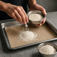 Każdą uformowaną kulkę obtocz obficie we wiórkach kokosowych przygotowanych w misce: włóż kulkę do miski z wiórkami i tocz ją delikatnie palcami, dociskając lekko, aby wiórki przylepiały się równomiernie. Układaj pralinki na przygotowanej blasze w odstępach około 1–1,5 cm.