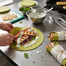 Gotowe wrapy możesz podać od razu, przekrojone na pół pod ostrym kątem, co pięknie wyeksponuje kolorowe wnętrze. Jeśli pakujesz je na wynos, zawiń każdego wrapa ciasno w papier śniadaniowy lub folię aluminiową. Powtórz proces składania i zwijania dla pozostałych trzech tortilli.