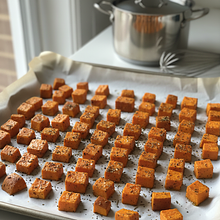 Rozgrzej piekarnik do 200°C (termoobieg) lub 220°C (góra-dół). Bataty dokładnie umyj, a następnie obierz za pomocą obieraczki do warzyw. Pokrój je w równą kostkę o boku około 1,5 cm. Ważne jest, aby kostki były podobnej wielkości, dzięki czemu upieką się równomiernie.