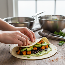 Oto przepis na idealne danie na wynos: sycące, zdrowe i niezwykle apetyczne wrapy, które zachwycają bogactwem kolorów i smaków. Sercem dania są kostki słodkiego batata, pieczone z dodatkiem wędzonej papryki i kminu rzymskiego, co nadaje im głęboki, lekko dymny aromat i cudowną miękkość. Kontrastu dodaje czarna fasola i kukurydza, a chrupkości i ostrości – drobno posiekana czerwona cebula. Całość spaja aksamitny, orzeźwiający sos przygotowany ze dojrzałego awokado, świeżo wyciśniętego soku z limonki i aromatycznej kolendry. Wrapy te są nie tylko pyszne, ale również doskonale zbilansowane pod względem odżywczym, dostarczając białka roślinnego, zdrowych tłuszczów, błonnika i witamin. Idealnie sprawdzają się jako lunch do pracy, posiłek na piknik czy szybka kolacja. Można je jeść na ciepło, zaraz po przygotowaniu, ale równie doskonale smakują na zimno, co czyni je niezwykle praktycznym rozwiązaniem.