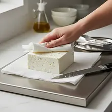Teraz czas na krojenie. Wyjmij ser feta z opakowania i delikatnie osusz go ręcznikiem papierowym. Połóż ser na desce do krojenia i pokrój go w równą kostkę o boku około 1,5 cm. Następnie weź umytego ogórka, odkrój końcówki i pokrój go w grube plastry, o grubości około 1 cm. Pomidorki i oliwki pozostaw w całości.