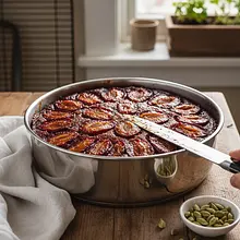 To niezwykle aromatyczne i wilgotne ciasto, które jest kwintesencją jesieni. Wyobraź sobie soczyste, dojrzałe śliwki węgierki, skąpane w głębokim, maślanym karmelu, tworzące na wierzchu ciasta lśniącą, kleistą mozaikę. Spód, a właściwie wierzch po odwróceniu, to puszyste, maślane ciasto o głębokim, korzennym aromacie, w którym dominuje cynamon, rozgrzewający imbir i szlachetny, lekko cytrusowy kardamon. Ciasto to, znane jako 'upside-down cake', piecze się 'do góry nogami', a cały jego urok ujawnia się dopiero po wyjęciu z pieca i odwróceniu na paterę. Podawaj je na ciepło, z kleksem gęstej, kwaśnej śmietany lub gałką lodów waniliowych, które idealnie zbalansują słodycz karmelu. Jest to idealny deser na chłodne popołudnia, spotkania z przyjaciółmi czy jako słodkie zwieńczenie rodzinnego obiadu.