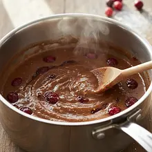 W międzyczasie, gdy ciasto stygnie, przygotuj konfiturę. Do małego garnka wsyp żurawinę (świeżą lub mrożoną), dodaj cukier i wlej świeżo wyciśnięty sok z pomarańczy. Gotuj na średniej mocy palnika, mieszając od czasu do czasu.