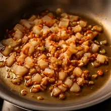 Cebulę i czosnek drobno posiekaj. Podsmaż na łyżce oleju, aż będą miękkie i lekko złote.