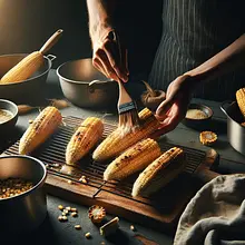 Przygotuj kolby do grillowania: usuń liście i 'włosy' z kukurydzy. Posmaruj każdą kolbę cienką warstwą oleju (możesz zmieszać olej z roztopionym masłem wegańskim, jeśli używasz — 30 g masła wegańskiego). Rozgrzej mocno patelnię grillową lub tradycyjną patelnię do średnio‑wysokiej temperatury (powinna być bardzo gorąca). Układaj kolby i grilluj, obracając co 2–3 minuty, przez 10–12 minut, aż pojawią się ciemne, lekko przypalone plamy i kolby będą wydawać przyjemny, dymny zapach.