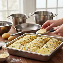 Zacznij układać warstwy w przygotowanym naczyniu żaroodpornym. Na dnie ułóż pierwszą warstwę osuszonych plasterków ziemniaków. Układaj je tak, aby lekko na siebie nachodziły, tworząc zwartą powierzchnię, podobnie jak dachówki. Ta warstwa powinna pokryć całe dno naczynia.