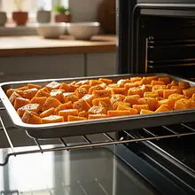 Wstaw blachę z dynią do nagrzanego piekarnika i piecz przez około 30-40 minut. Dynia jest gotowa, gdy miąższ jest bardzo miękki (widelec powinien wchodzić w niego bez żadnego oporu), a brzegi zaczynają się lekko karmelizować i brązowieć. Po upieczeniu wyjmij blachę z piekarnika i odstaw do lekkiego przestygnięcia.