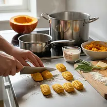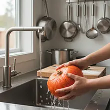 Rozgrzej piekarnik do 200°C (termoobieg lub 220°C góra-dół). Dokładnie umyj dynię Hokkaido. Ostrożnie, używając dużego, ostrego noża, przekrój ją na pół. Za pomocą metalowej łyżki wydrąż nasiona i włóknisty miąższ ze środka. Każdą połówkę pokrój na mniejsze kawałki, np. ćwiartki. Ułóż kawałki dyni skórą do dołu na blasze wyłożonej papierem do pieczenia. Wstaw do nagrzanego piekarnika i piecz przez około 30-40 minut. Dynia jest gotowa, gdy miąższ jest bardzo miękki – widelec powinien wchodzić w niego bez żadnego oporu.