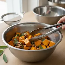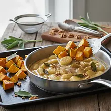To danie to kwintesencja jesieni na talerzu. Aksamitne, delikatne gnocchi ziemniaczane otulone kremowym sosem na bazie pieczonej dyni hokkaido, której naturalna słodycz doskonale komponuje się z ziemistym aromatem świeżej szałwii. Każdy kęs to połączenie miękkich kluseczek, rozpływającej się w ustach dyni i chrupiących, podprażonych orzechów włoskich, które dodają potrawie głębi i tekstury. Całość dopełnia wyrazisty, słony smak parmezanu, który idealnie balansuje słodycz dania. Wizualnie potrawa zachwyca ciepłą, pomarańczową barwą, przełamaną zielenią listków szałwii. Jest to danie niezwykle sycące i rozgrzewające, idealne na chłodniejsze dni. Można je podawać jako wykwintne danie główne na specjalne okazje, ale jest na tyle proste w przygotowaniu, że sprawdzi się również jako pomysł na wyjątkowy, codzienny obiad.