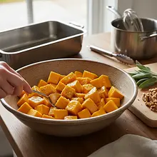 Rozgrzej piekarnik do 200°C (termoobieg) lub 220°C (góra-dół). Dokładnie umyj dynię hokkaido. Ponieważ jej skórka jest jadalna, nie musisz jej obierać. Przekrój dynię na pół, a następnie za pomocą łyżki usuń gniazdo nasienne wraz z włóknami. Miąższ pokrój w kostkę o boku około 2-3 cm. Pamiętaj, aby kostki były w miarę równej wielkości, dzięki czemu upieką się równomiernie.