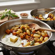 To danie to kwintesencja jesiennego komfortu, idealne na chłodne wieczory, gdy nie wiesz, na co masz ochotę. Łączy w sobie delikatne, poduszeczkowate kluseczki gnocchi z aksamitnym, kremowym sosem na bazie masła szałwiowego i śmietanki. Główną rolę gra tu pieczona dynia hokkaido, której naturalna słodycz jest doskonale karmelizowana w piekarniku i podkreślona nutą gałki muszkatołowej. Chrupkości dodają prażone orzechy włoskie, a całość spaja intensywny, lekko orzechowy smak parmezanu. Danie jest nie tylko niezwykle smaczne, ale również pięknie prezentuje się na talerzu dzięki kontrastującym kolorom – głębokiemu pomarańczowi dyni, zieleni szałwii i bieli kremowego sosu. Podawać je można jako wykwintne danie główne na kolację we dwoje lub jako sycący, wegetariański obiad dla całej rodziny. Jest to przepis, który udowadnia, że proste, sezonowe składniki potrafią stworzyć danie godne najlepszej restauracji.