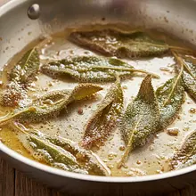 W dużym garnku zagotuj osoloną wodę na gnocchi (około 2 litry wody i 1 łyżeczka soli). W międzyczasie przygotuj sos. Na dużej, głębokiej patelni rozpuść masło na średniej mocy. Gdy masło się rozpuści i zacznie pienić, dodaj całe listki szałwii.