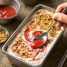 Na wierzchu wykonaj finalne smugi: łyżką nałóż kilka łyżek puree w różnych miejscach i przeciągnij wykałaczką lub nożem, aby zrobić efekt marmurkowy. Jeśli używasz opcjonalnych dodatków (pistacje, kawałki czekolady), posyp je teraz równomiernie po wierzchu. Zawinąć wystającą folię i włóż foremkę do zamrażarki.