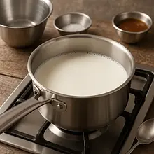 W rondlu na średnim ogniu podgrzej mleko (300 ml) i 200 ml śmietanki (odstawionej z całej ilości) razem z kakao (30 g). Mieszaj trzepaczką, aby kakao rozpadło się i nie tworzyły się grudki. Podgrzewaj do momentu, gdy para zacznie się wydobywać, a masa będzie gorąca, ale nie dopuszczaj do wrzenia (ok. 80°C — masa ma lekko parować).