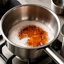 W rondelku o grubym dnie rozpuść 100 g cukru na średnim ogniu, obserwując jak najpierw tworzą się kryształki, potem płynny bursztynowy syrop. Gdy cukier osiągnie złoto-bursztynowy kolor (po 6-8 minutach), natychmiast dodaj pokrojone masło (50 g) i mieszaj, aż się rozpuści. Następnie powoli wlej podgrzaną śmietankę do karmelu (100 ml) trzymając rondel z boku i mieszając — zachowaj ostrożność, mieszanina będzie mocno bulgotać. Na końcu dodaj sól morską (2 g), wymieszaj i odstaw do lekkiego przestygnięcia.