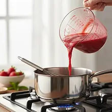 Przelej przygotowany mus truskawkowy do małego rondelka z grubym dnem. Postaw na średniej mocy palnika i podgrzewaj, od czasu do czasu mieszając, aż mus zacznie delikatnie bulgotać. Zmniejsz moc palnika do minimum i gotuj mus przez około 5-7 minut. Mus powinien lekko zgęstnieć i zredukować swoją objętość – odparowanie części wody sprawi, że lody będą bardziej kremowe. Zdejmij rondelek z ognia i przelej mus do miseczki. Odstaw do całkowitego wystudzenia, a następnie wstaw do lodówki na minimum 30 minut, aby był zimny.