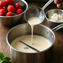 Przelej mieszankę z powrotem do garnka i podgrzewaj na niskim ogniu, mieszając drewnianą łyżką, aż krem zgęstnieje i pokryje łyżkę (tzw. konsystencja 'angielskiej kremówki'). To zajmie około 5-8 minut. Nie dopuszczaj do wrzenia — temperatura powinna osiągnąć ok. 82-85°C (jeśli masz termometr).