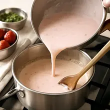 Delikatne, domowe lody inspirowane klasycznymi lodami truskawkowymi, ale z autorskim twistem: aksamitna baza na mascarpone i świeżym jogurcie greckim, słodzone delikatnie cukrem i podkreślone świeżą bazylią oraz skórką cytrynową. Truskawki są najpierw lekko dosładzane i zmiękczane, aby wydobyć ich naturalny sok, a następnie przecierane, by uzyskać jednolitą, intensywną barwę i smak. Całość łączy się z kremową masą jajeczno-śmietankową, którą poddaje się krótkiej pasteryzacji, co daje stabilną konsystencję i bogaty, jedwabisty smak. Danie świetnie sprawdza się jako elegancki deser na letnie przyjęcie, ale też jako słodka przyjemność dla dzieci. Wizualnie prezentuje się efektownie — równomierny różowy kolor z zielonymi akcentami bazylii i chrupiącymi pistacjami (opcjonalnie) — i jest idealne do podania w waflowych rożkach, pucharkach lub jako dodatek do ciast i tart.