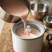 Alternatywa bez maszynki: wlej masę do szerokiego, płaskiego pojemnika i włóż do zamrażarki. Co 30 minut przez pierwsze 3 godziny wyjmuj pojemnik i energicznie mieszaj widelcem lub mikserem ręcznym, rozbijając tworzące się kryształki lodu. Po tym czasie odstaw do całkowitego stężenia (ok. 3-4 godziny).