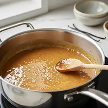 Zmniejsz moc palnika do minimum. Ostrożnie dodaj 60g masła pokrojonego w kostkę. Mieszanina zacznie gwałtownie bulgotać i pryskać - zachowaj szczególną ostrożność. Mieszaj energicznie rózgą kuchenną, aż masło całkowicie połączy się z karmelem.