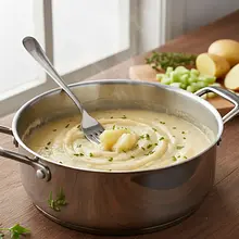 Zdejmij garnek z odparowanymi warzywami z ognia. Użyj tłuczka do ziemniaków lub praski, aby dokładnie rozgnieść warzywa na gładką masę. Kiedy nie będzie już dużych grudek, zacznij stopniowo, w trzech partiach, wlewać gorącą mieszankę masła i śmietanki, za każdym razem energicznie mieszając masę za pomocą drewnianej łyżki lub trzepaczki, aż do całkowitego połączenia. Na koniec dodaj biały pieprz i, jeśli używasz, świeżo startą gałkę muszkatołową. Mieszaj do uzyskania jednolitej, aksamitnej konsystencji.