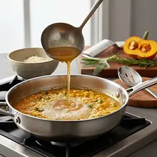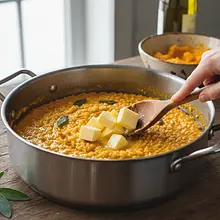Po około 15 minutach spróbuj ziarenko ryżu. Powinno być już prawie miękkie, ale wciąż stawiać lekki opór pod zębem ('al dente'). W tym momencie dodaj przygotowane wcześniej purée z dyni. Dokładnie wymieszaj, aby połączyło się z ryżem i gotuj jeszcze przez 2-3 minuty, w razie potrzeby dodając ostatnią chochlę bulionu. Konsystencja powinna być płynna, kremowa, ale nie wodnista.