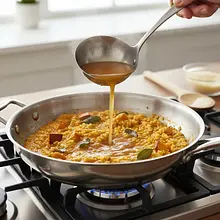 Zmniejsz ogień do średnio-niskiego. Wlej pierwszą chochelkę gorącego bulionu (około 150-200 ml), tak aby przykryła ryż. Mieszaj powoli i niemal nieustannie. Poczekaj, aż ryż wchłonie niemal cały płyn, zanim dodasz kolejną porcję. Ruch mieszania uwalnia skrobię z ziaren, co tworzy kremowy sos.