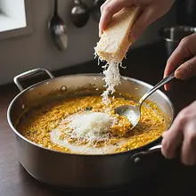 Zdejmij garnek z ognia. To najważniejszy moment – 'mantecatura'. Dodaj świeżo starty ser Parmezan. Energicznie mieszaj risotto przez około minutę, aby ser się rozpuścił i połączył ze skrobią, tworząc idealnie kremową emulsję. Risotto powinno mieć konsystencję gęstej lawy, powoli rozpływającej się na talerzu ('all'onda').