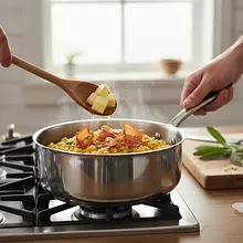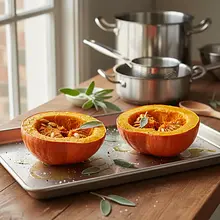 Rozgrzej piekarnik do 200°C (termoobieg). Dynię Hokkaido dokładnie umyj, przekrój na pół i za pomocą łyżki usuń nasiona oraz włóknisty miąższ. Pokrój dynię na mniejsze kawałki (ok. 3-4 cm), ułóż na blasze wyłożonej papierem do pieczenia skórką do dołu. Piecz przez około 20-25 minut, aż miąższ będzie całkowicie miękki (sprawdź widelcem - powinien wchodzić bez oporu). Po upieczeniu lekko ostudź, a następnie oddziel miąższ od skórki (powinien łatwo odchodzić) i zblenduj na gładkie purée. Odstaw na bok.