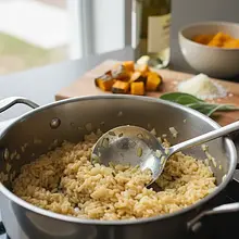 Wsyp ryż Arborio do garnka z cebulą i czosnkiem. Zwiększ ogień i smaż przez około 2 minuty, ciągle mieszając, aż ziarenka pokryją się tłuszczem i staną się lekko przezroczyste na brzegach, a ich środek pozostanie biały (perłowy). Ten proces nazywa się 'tostatura' i pomaga zachować kształt ziaren podczas gotowania.